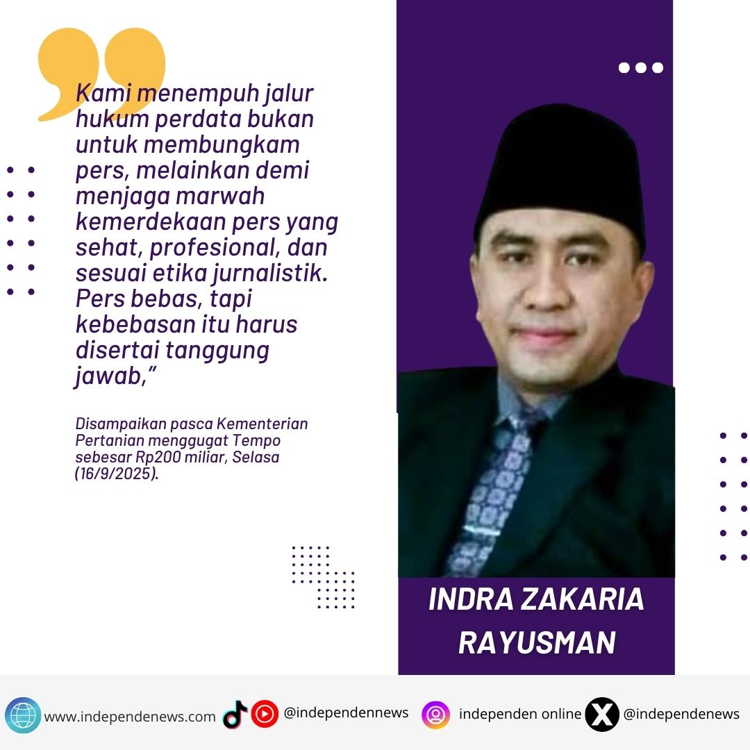 “Kami menempuh jalur hukum perdata bukan untuk membungkam pers, melainkan demi menjaga marwah kemerdekaan pers yang sehat, profesional, dan sesuai etika jurnalistik. Pers bebas, tapi kebebasan itu harus disertai tanggung jawab,” ujar Indra Zakaria di Jakarta, Selasa (16/9).